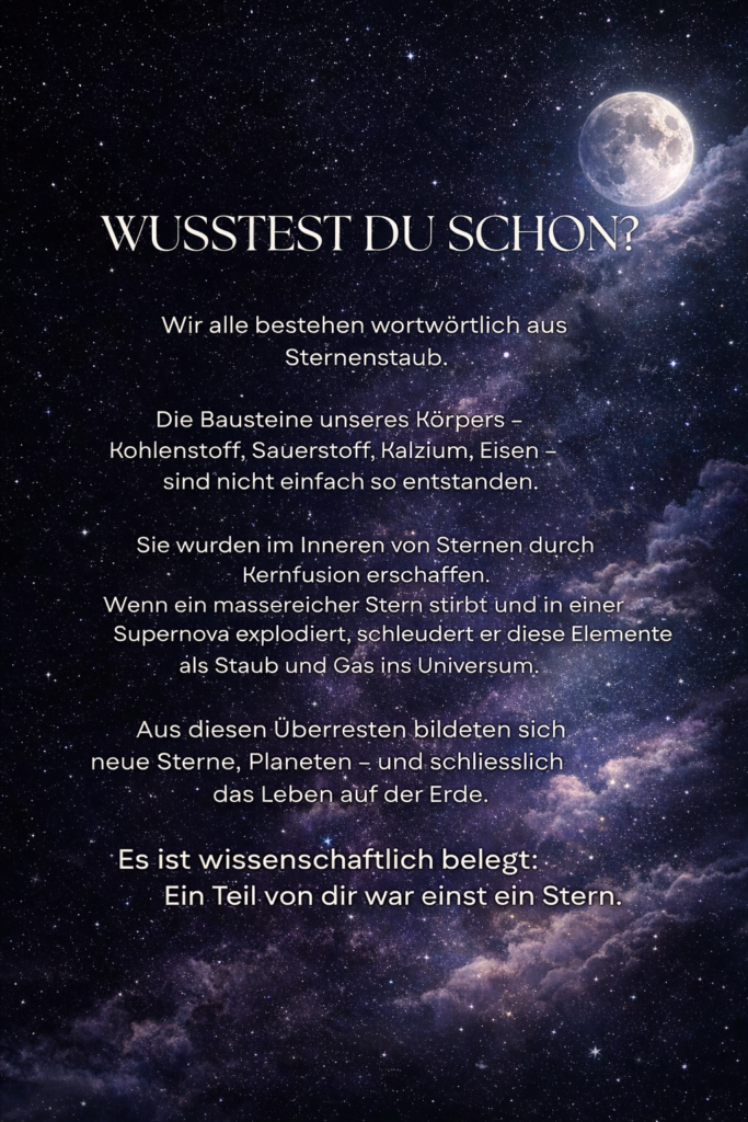 Sterne faszinieren die Menschheit seit Tausenden von Jahren. Wenn wir nachts in den Himmel schauen, sehen wir Milliarden leuchtender Punkte, die unser Universum erhellen. Doch eine erstaunliche wissenschaftliche Tatsache macht diese Beobachtung noch beeindruckender: Wir selbst bestehen aus Sternenstaub. In gewisser Weise sind wir tatsächlich Sterne.