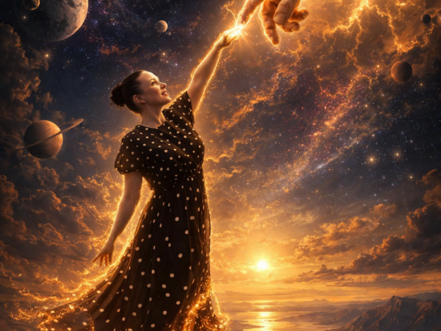 Dieses Bild bin ich –nicht in einer Form, sondern in einem Zustand. Zwischen Himmel und Erde,mit ausgestreckter Hand,immer in Bewegung –und doch gehalten. Ich bin durch Zeiten gegangen,die mich leise …